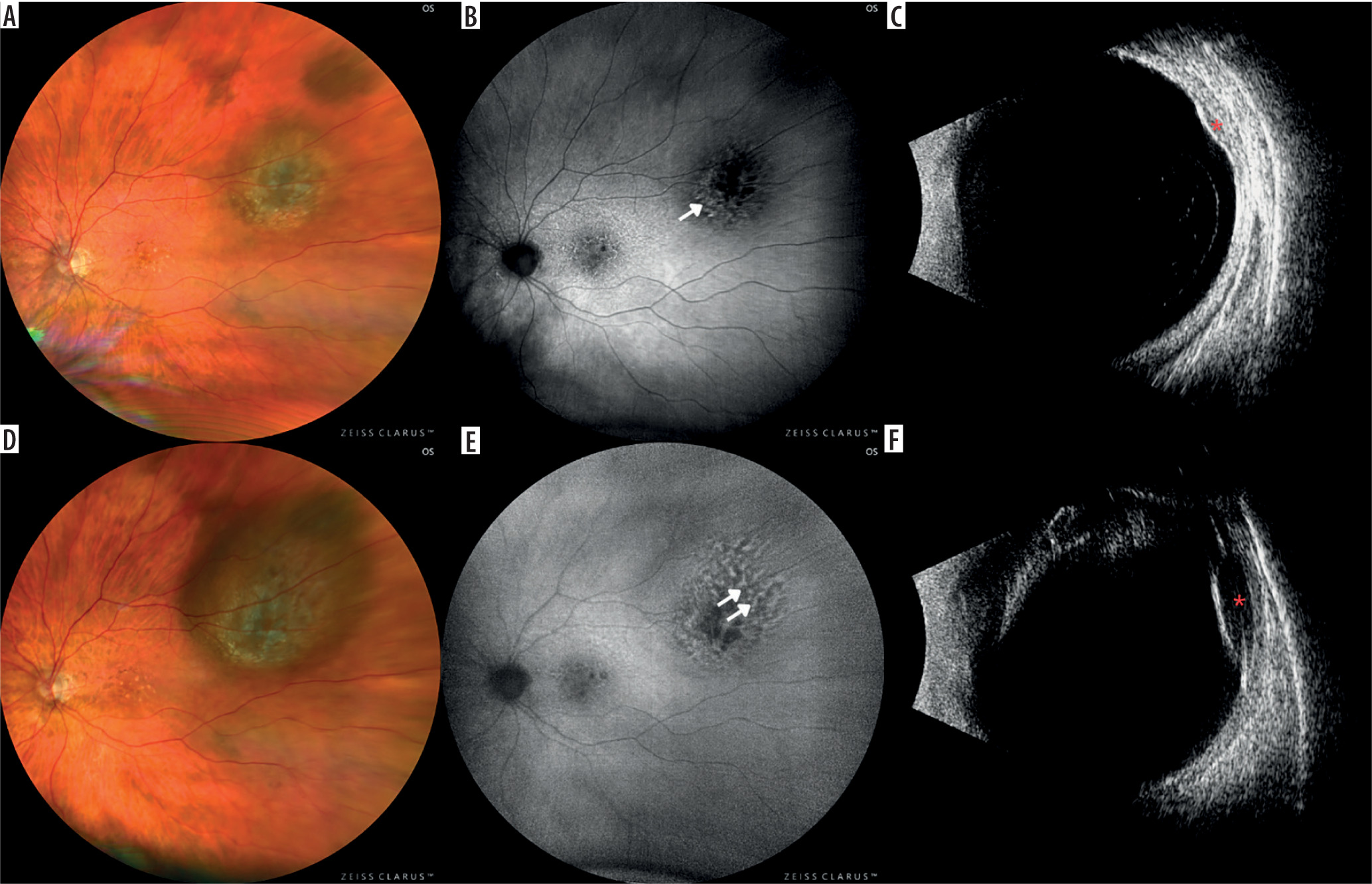 Nevus with a documented growth into a melanoma in a 72-year-old patient within 9 months. The lesion was observed for more than 10 years and no features of progression were detected: A) color fundus photography of the observed nevus; B) fundus autofluorescence. photography showing mildly hyperautofluorescent drusen (arrow); C) ultrasound image showing mildly hypoechogenic lesion (red asterisk); D) color fundus photography after 9 months with evident growth; E) fundus autofluorescence photography of the newly appeared orange pigment in the upper portion of the lesion (double arrow); F) ultrasound image of growing hypoechogenic lesion (red asterisk)
