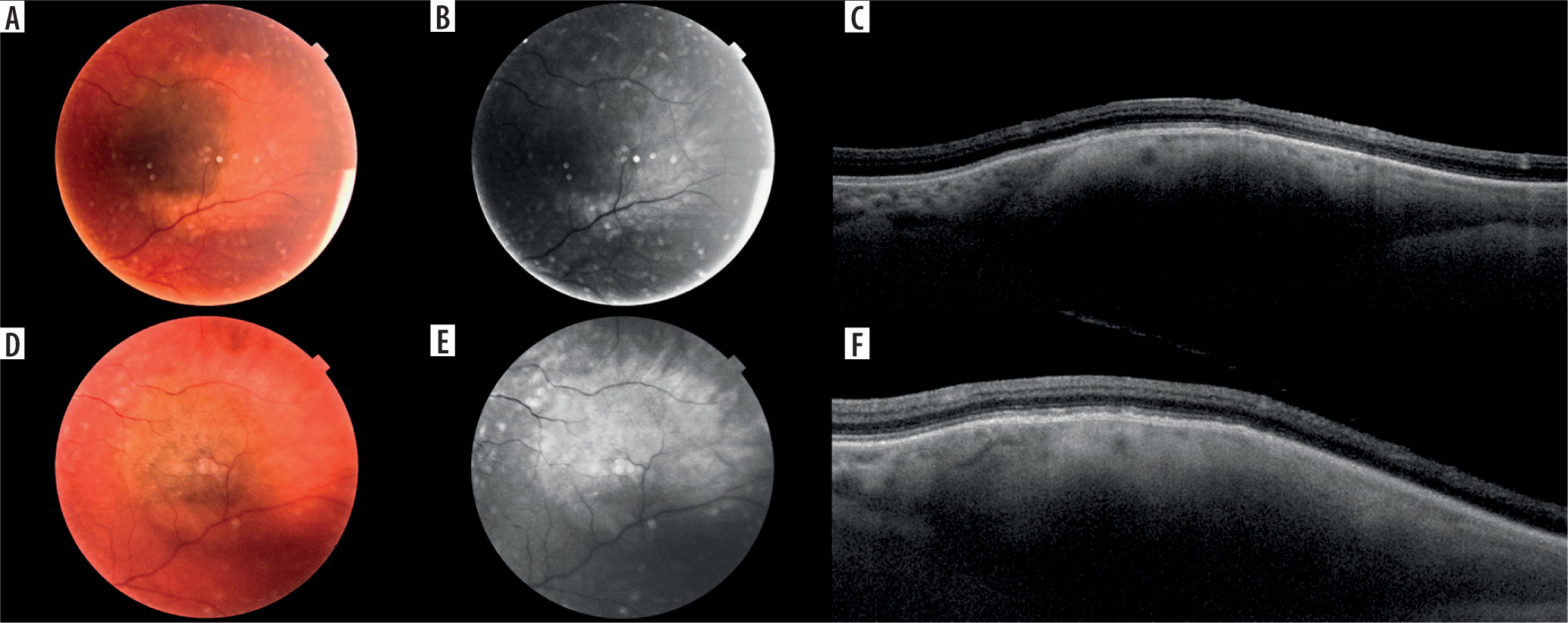 The first big analysis on prognostic clinical findings was presented by Shields et al. in 1995 [28]. A group of 1,329 patients with small (< 3 mm) choroidal melanocytic tumors were studied for symptoms correlating with tumor growth and risk for metastatic disease. The features related to tumor growth were tumor thickness > 2 mm, presence of subretinal fluid (SRF), flashes and floaters (symptoms), presence of lipofuscin deposits on the tumor’s surface (orange pigment), and posterior tumor margin within 3 mm from the optic disc. The factors predictive of metastatic disease were greater thickness of the lesion, posterior tumor margin at the optic disc, and documented growth. It is worth noting that a low growth rate (up to 0.5 mm) may be observed during the natural course of benign nevi [29], but many benign lesions remain stable over time (Figure 2). The presence of 3 risk factors was related to over 50% risk of tumor growth, and the combination that was most dangerous, with growth risk of 69%, was thickness > 2 mm, location at the disc margin, and symptoms. The authors developed a mnemotechnic to easily remember those five features – ‘‘To Find Small Ocular Melanoma’’ (thickness > 2 mm, subretinal Fluid, Symptoms, Orange pigment, location at the disk Margin) – which quickly proved very useful in everyday clinical practice [28, 29] and remained so for years.