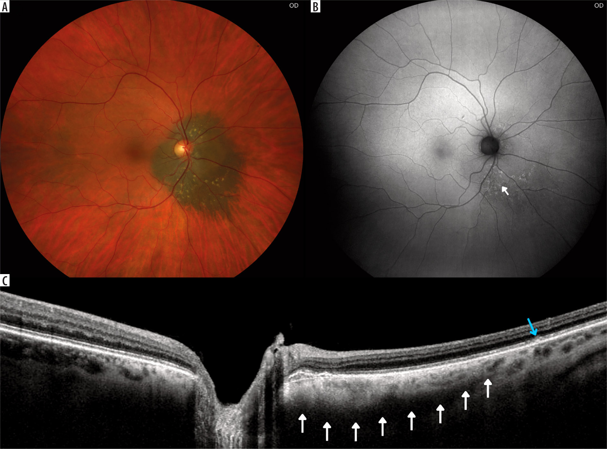 Giant nevi in 58-year-old patient, located close to the optic disc with drusen and no other risk factors for malignant transformation (T-F-S-O-M-DiM+): A) color fundus picture; B) fundus autofluorescence photography showing mildly hyperautofluorescent drusen (arrow); C) optical coherence tomography showing hyperreflective choroidal nevus (white arrows) with drusen (blue arrow) and its location close to the optic nerve