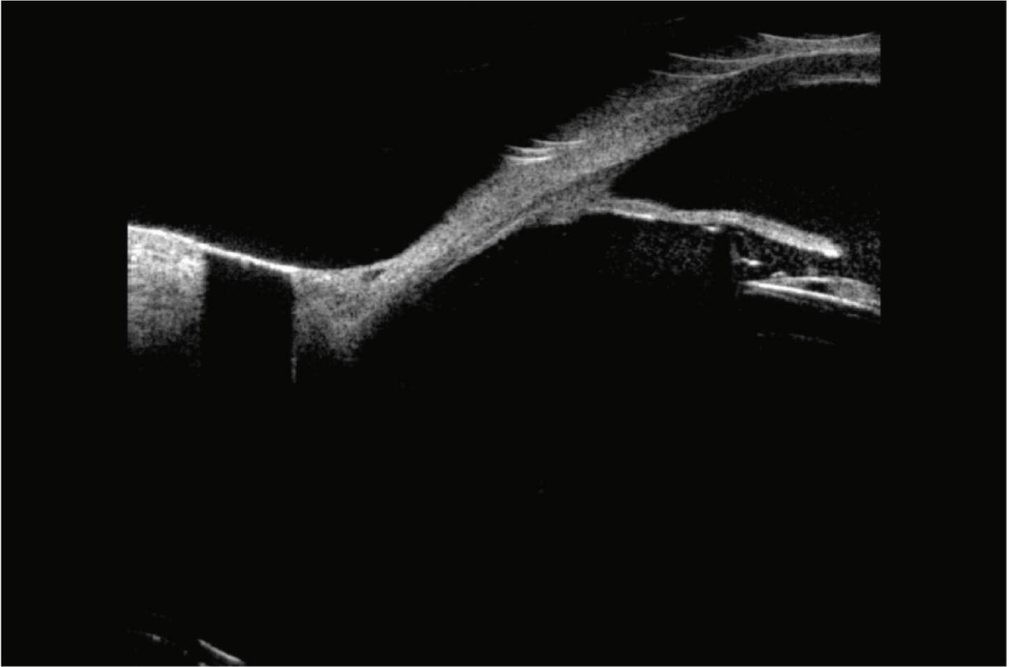 Ultrasonic biomicroscopy (UBM). IOL of a foldable piece making contact with the posterior face of the iris