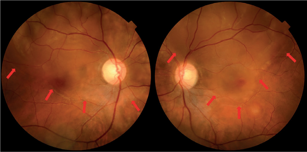 Fundus photographs showing bilateral serous retinal detachment taken 1 day after onset. The red arrows indicate the inferior border of the detachment, which appears as a well-demarcated area of retinal elevation due to subretinal fluid accumulation