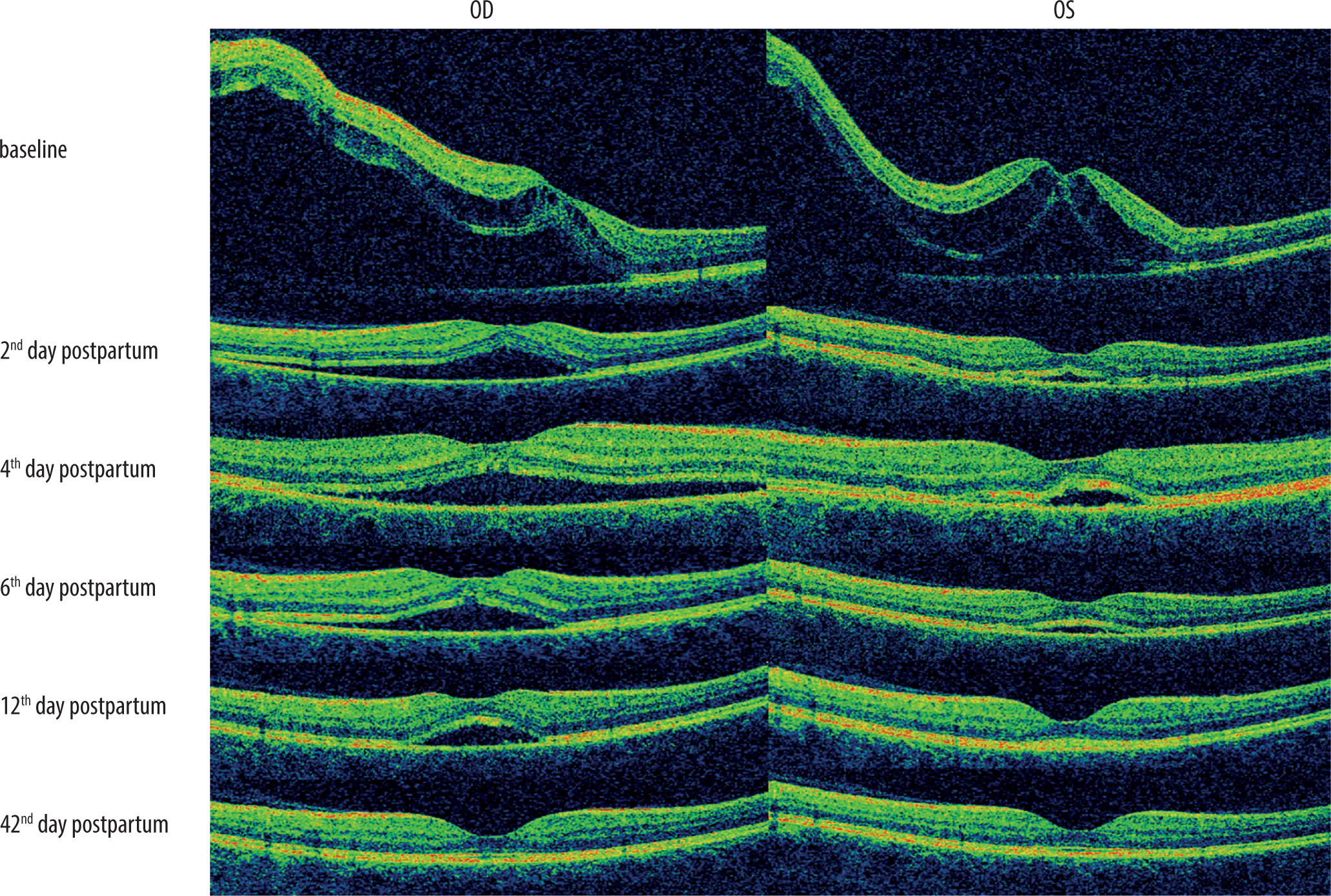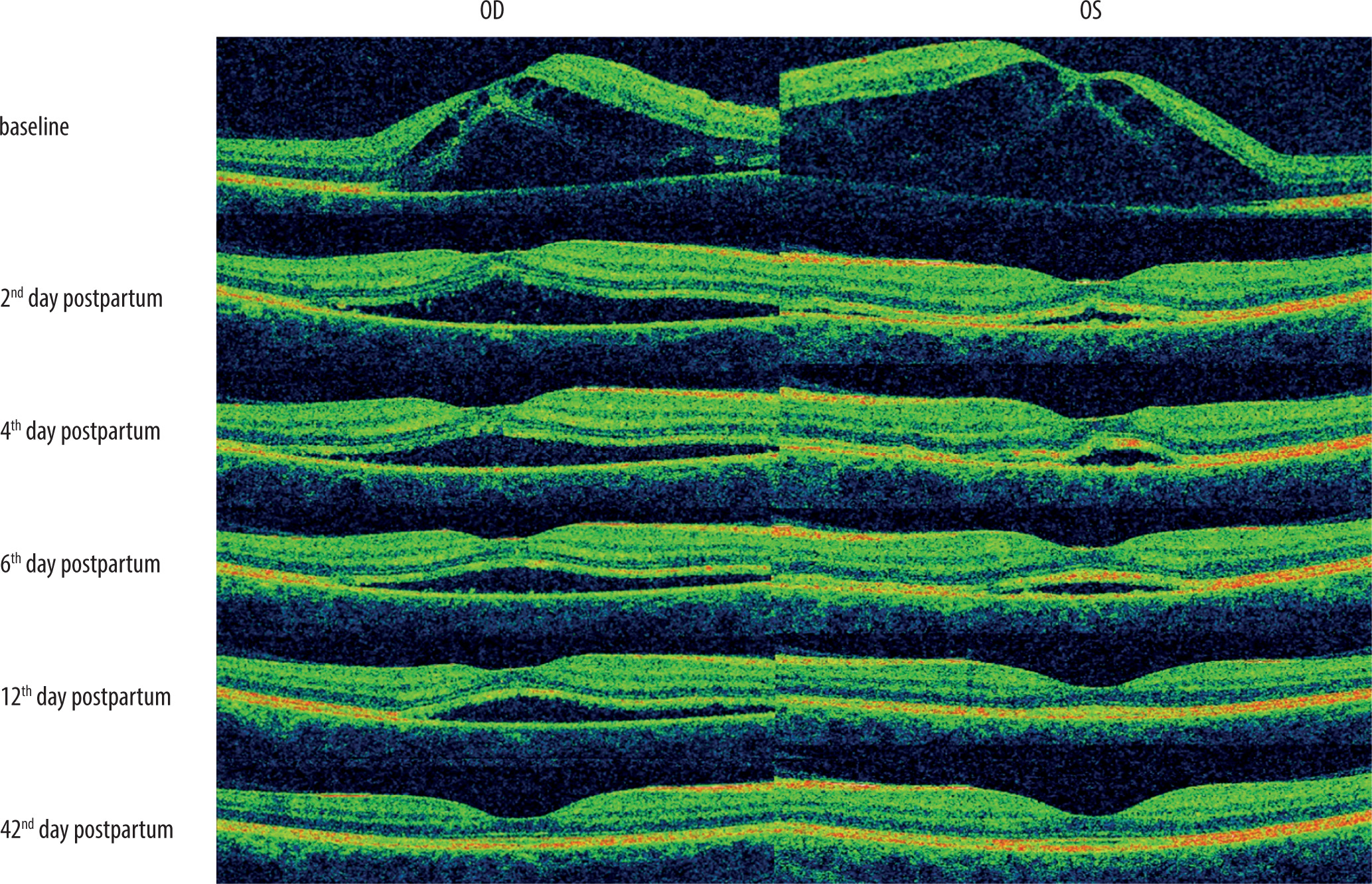 The prognosis regarding visual acuity in this group of patients is generally good. Changes at the posterior pole of the eye regress spontaneously in most cases. It has been reported that complete reabsorption of subretinal fluid and restoration of visual acuity typically occur within 1 to 12 weeks [10]. In the presented case, full regression of SRD and return to baseline visual acuity occurred within 5 weeks, which is consistent with literature data. Best-corrected visual acuity of 1.0 was achieved in both eyes, and no structural abnormalities were seen on follow-up OCT.