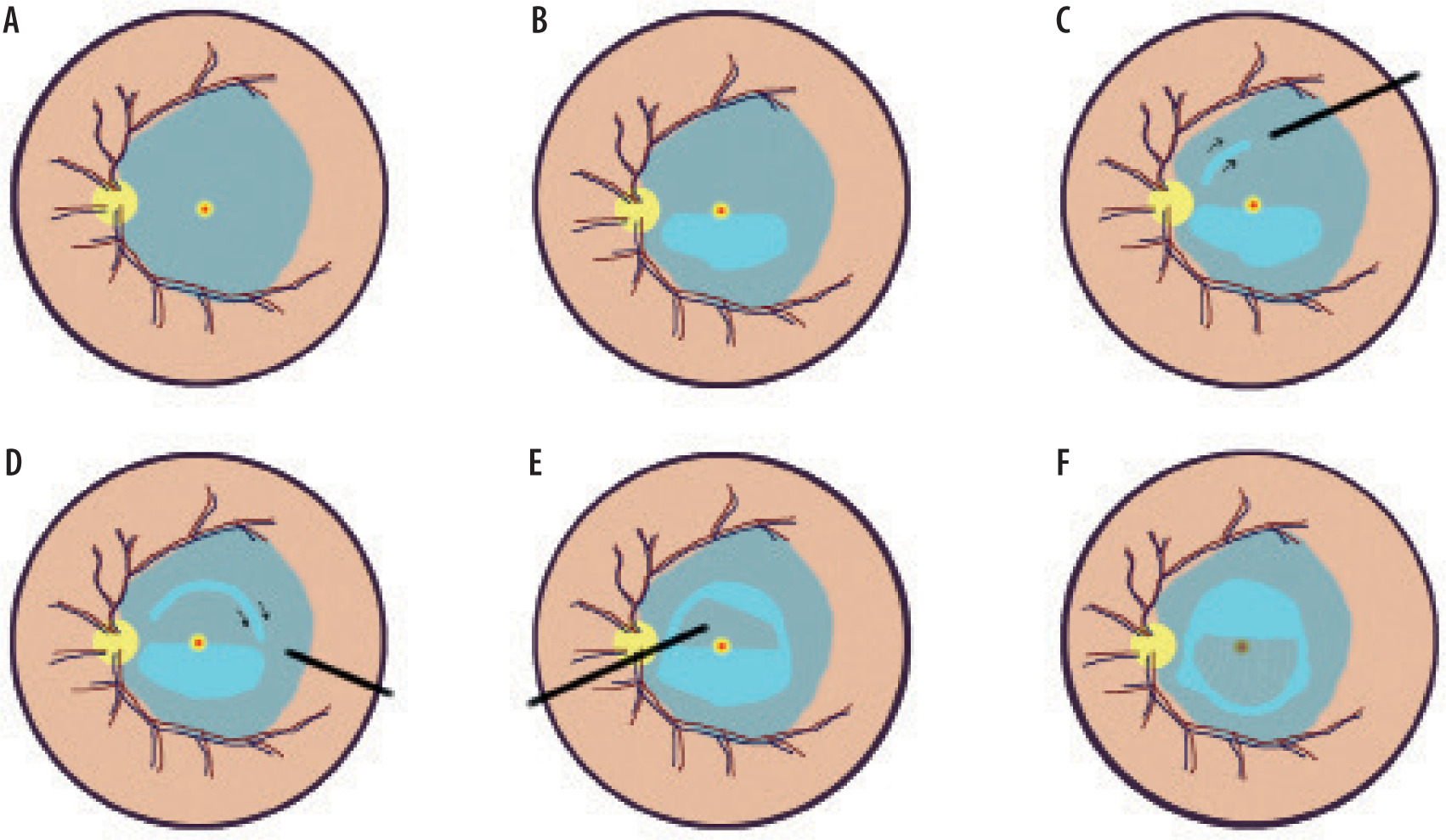 Diagrammatic presentation of the surgical technique for creating a large semicircular internal limiting membrane (ILM) flap: A) The ILM within the vascular arcade is stained with indocyanine green. B) The ILM in the lower macular region is peeled along the vascular arcade toward the edge of the macular hole (MH), covering approximately 180°. C) The ILM is grasped with forceps at the upper (temporal or nasal) part, around two optic disc diameters from the MH, following a circular motion. D) Peeling continues by grasping the edge of the outer ILM tear and progressing circularly. E) After the flap is fully released, it is separated from the retina about 100 µm from the edge of the hole. F) The ILM flap is inverted and placed over the macula [22]