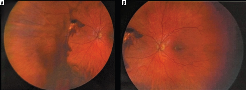 Late complications after surgical management of trauma include mechanical complications such as glaucoma, epiretinal membranes, post-traumatic cataracts, vitreoretinal proliferations, retinal breaks, or tractional retinal detachment. Chemical complications include calcification and siderosis, and in addition to these, inflammation or atrophy of the eyeball can occur [14]. The etiology of secondary traumatic complications, analogous to primary complications, can be mechanical, chemical, or inflammatory. There is no clear position in the literature on the incidence of late injuries of mechanical origin, but the most commonly described complications include post-traumatic cataract (15-57%), retinal detachment (11-46%) and the development of vitreoretinal proliferations (15-25%) [3, 14-18]. As for traumas of chemical etiology, they occur in injuries with the presence of metallic foreign bodies, the most common pathologies being calcification and siderosis. The time at which these complications occur is usually distant from the time of injury, and depends on whether the foreign body was successfully removed or if it was done with a long delay. These complications usually appear a few weeks or months after the accident, but can occur even a few years after the injury [14].