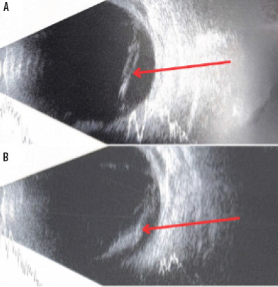 A, B. Ultrasound B-scan examination of the left eye on the day of admission, vitreous hemorrage is indicated by red arrows