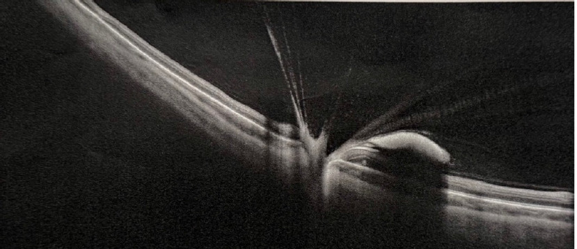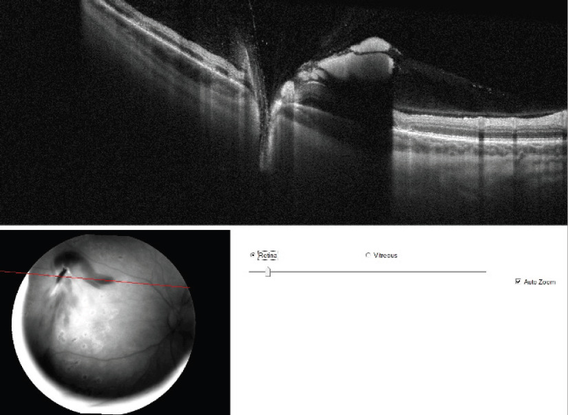 Optical coherence tomography examination of the left eye on the day of admission, showing the site of retinal injury with vitreoretinal junction and disruption of the neurosensory retina was visualized