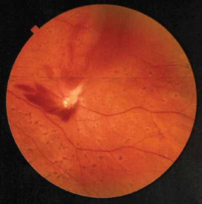 Examination of the anterior segment of the eye revealed no abnormalities in the cornea, a clear anterior chamber with no signs of Tyndall effect, a transparent lens, and preserved visibility of the fundus. Fundoscopic examination revealed the optic disc (n. II) with clear borders, the macula with a reflex, vitreous hemorrhage, a full-thickness wound of the eye wall at 10 o’clock surrounded by small hemorrhages, local retinal detachment, and hemorrhagic opacities in the nasal quadrants hindering the assessment of the retina (Figure 1). In the ultrasound examination of the left eyeball, a hemorrhage into the vitreous body was visualized (Figure 2).