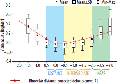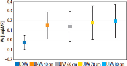 The clinical evaluation performed on all subjects 12 months after surgery included the following: autorefraction; binocularly: UDVA (logMAR ETDRS chart at 4 m), UNVA (at 40 cm) and UIVA (at 60, 70, 80 cm); defocus curve with ETDRS chart positioned at 6 m assessed under photopic conditions – the change of VA by addition of 0.5 D increments at each step towards hyperopia (0 to +1.5 D) and myopia (0 to −3.0 D); distance contrast sensitivity (CS) (2.5 m) assessed under photopic (85 cd/m2) and mesopic (3 cd/m2) conditions, near CS (40 cm) assessed under photopic conditions (1.5, 3, 6, 12, and 18 cycles/degree, CSV-1000, Functional Acuity Contrast Test – FACT); spectacle independence; subjective perception of photic phenomena (glare and halo); patient satisfaction (modified VFQ-25) [9]; and postoperative complications.