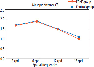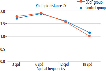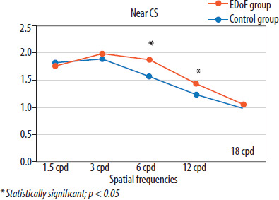 Figures 3 and 4 show the mean binocular CS values under photopic (85 cd/m2) and mesopic (3 cd/m2) conditions for far distance compared to the age-matched control group. Contrast sensitivity was similar under photopic and mesopic conditions. We found no statistically significant differences between patients with EDoF IOLs and the control group (p > 0.05). Figure 5 shows the mean binocular CS values under photopic conditions for near distance. Statistically significant differences in favor of the control group (p < 0.05) occurred for the frequencies of 6 cpd and 12 cpd.