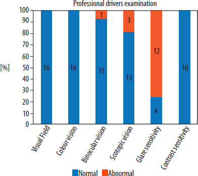 The results of the survey of professional drivers are presented in Figure 6. All 16 examined patients achieved correct test results in terms of visual field, color recognition, and CS. One patient had an abnormal result in the binocular vision test (1 of 16 = 6.25%), 3 in the scotopic test (3 of 16 = 18.75%), and 12 patients presented abnormal results of the glare sensitivity test (12 of 16 = 75%).